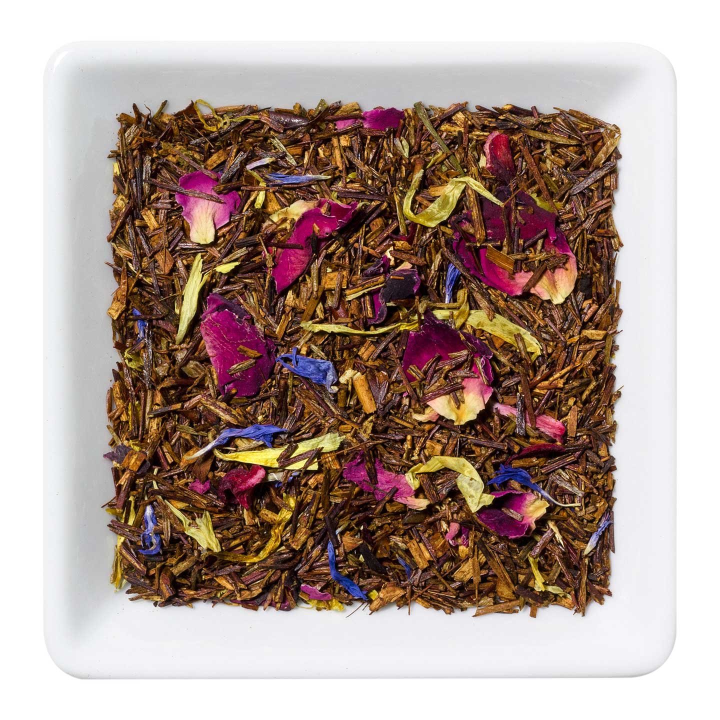 Rooibos tea, hibiscus, rose petals, marigold petals, cornflower petals